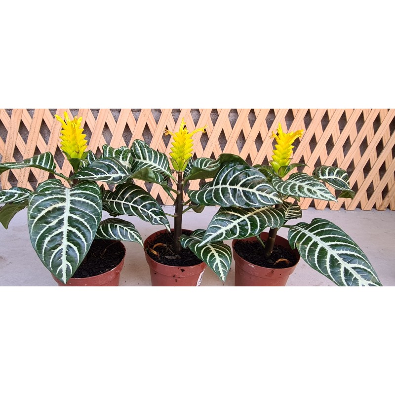 Planta de interior, tropical, con bellas hojas con nervaduras blancas y una floración en forma de espiga amarilla espectacular!